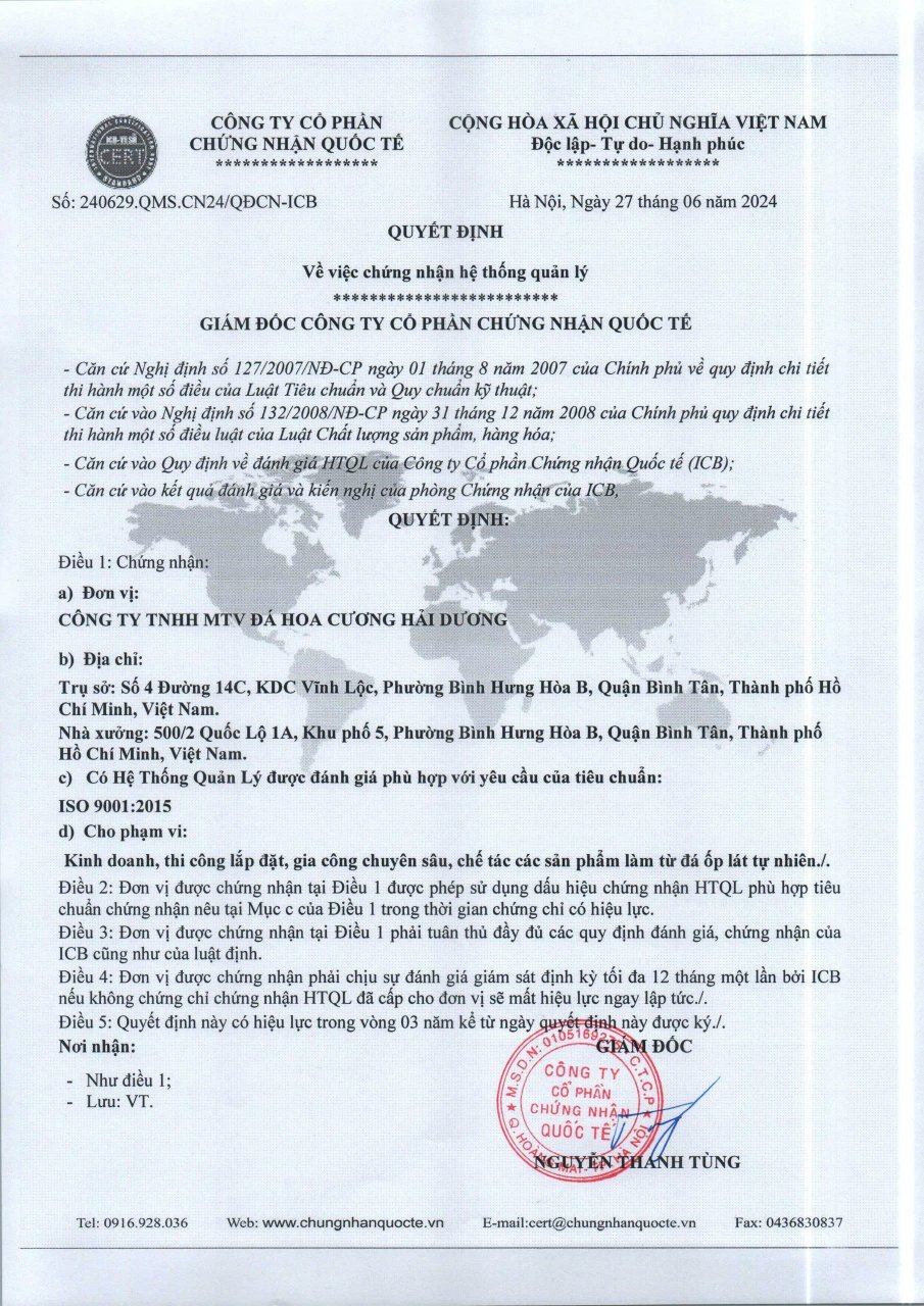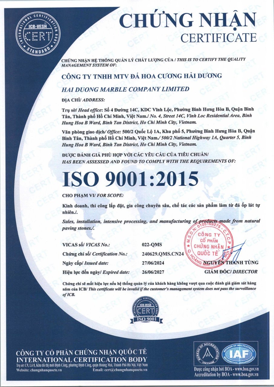 Hải Dương định hướng trở thành đối tác chiến lược trong chuỗi cung ứng vật liệu đá, cam kết chất lượng – tiến độ – uy tín trong từng hạng mục thi công, góp phần tạo nên những công trình bền vững và thẩm mỹ vượt trội.