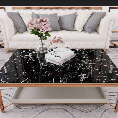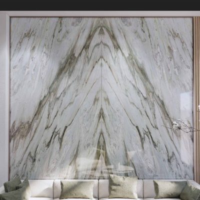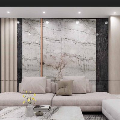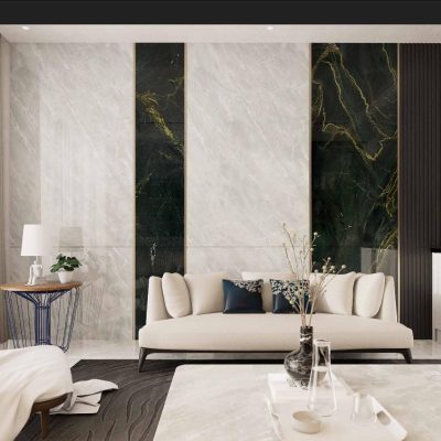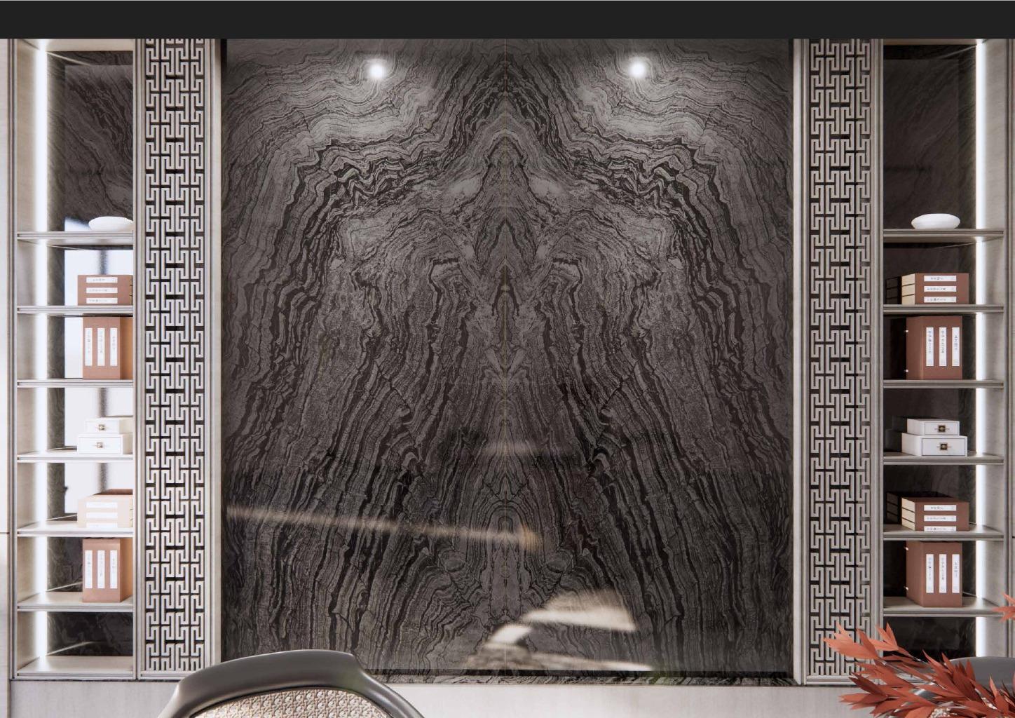 - Tông màu chủ đạo là đen tuyền huyền bí, điểm xuyến những đường vân trắng hoặc xám uốn lượn mềm mại như vân gỗ trên bề mặt đá, tạo nên vẻ đẹp sang trọng, quyền lực và độc đáo cho không gian.
