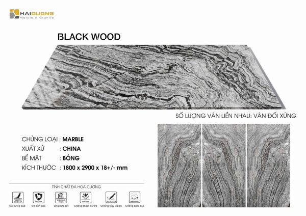 - Tông màu chủ đạo là đen tuyền huyền bí, điểm xuyến những đường vân trắng hoặc xám uốn lượn mềm mại như vân gỗ trên bề mặt đá, tạo nên vẻ đẹp sang trọng, quyền lực và độc đáo cho không gian.