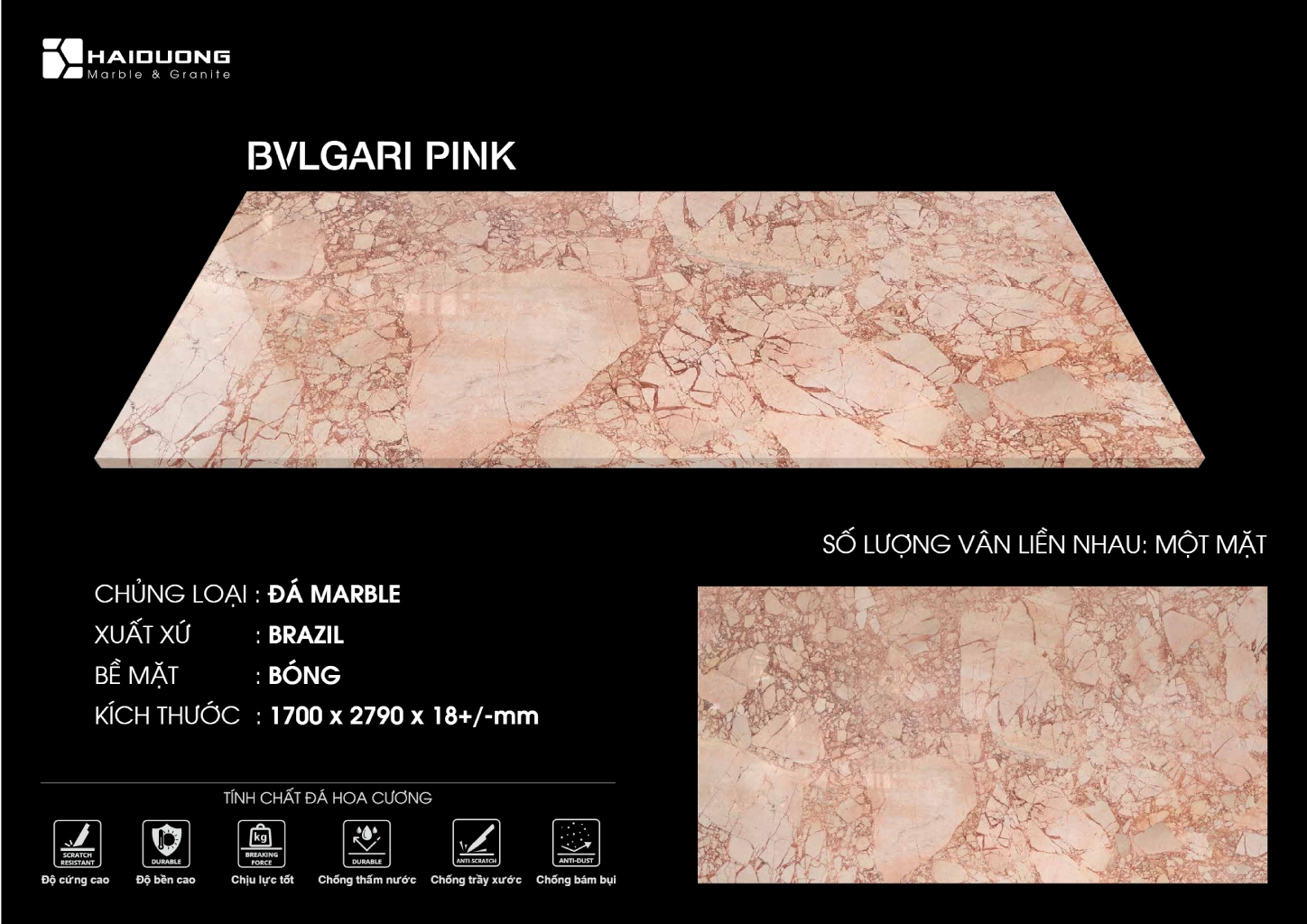 Bề mặt đánh bóng giúp tôn lên sắc hồng mềm mại và đường vân tự nhiên, mang lại cảm giác thanh lịch, tinh tế nhưng vẫn đủ nổi bật để trở thành điểm nhấn trong không gian.