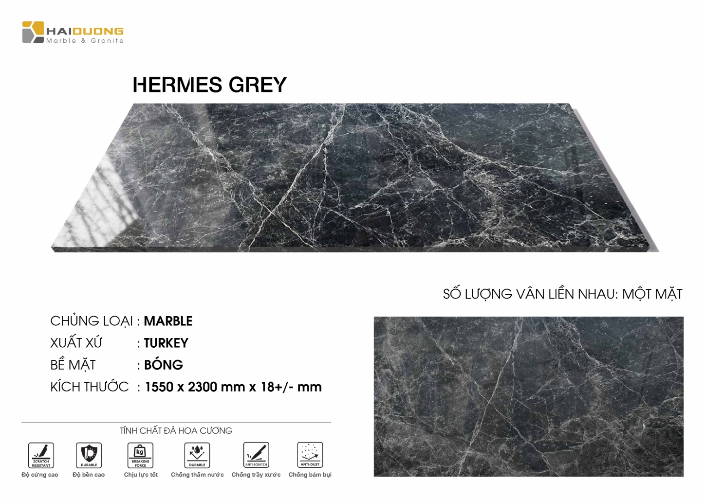 Lưu ý: Là dòng đá marble, Hermes Grey không khuyến nghị sử dụng cho hạng mục ốp bếp, nhằm đảm bảo độ bền và hiệu quả sử dụng lâu dài.