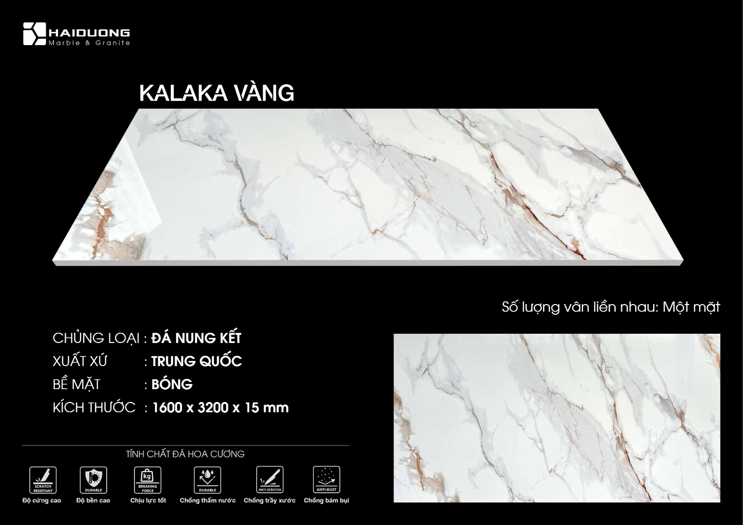 KALAKA VÀNG với màu sắc chủ đạo là màu trắng, kèm với đó là những đường vân cam vàng và xám, tạo nên sự độc đáo và mềm mại. Phù hợp cho nhiều ứng dụng nội thất hiện đại như ốp tường, lát sàn hay mặt bàn. Đá có độ cứng cao, chịu lực tốt, chống thấm nước, trầy xước và bám bẩn hiệu quả, đảm bảo độ bền và tính thẩm mỹ lâu dài.