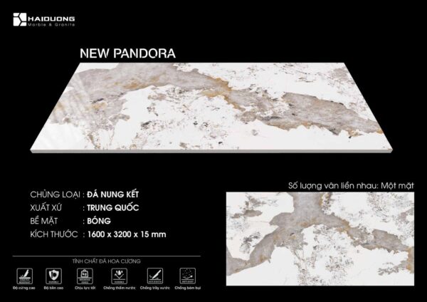 New Pandora là mẫu đá nung kết nổi bật với hoạ tiết độc đáo, kết hợp giữa nền trắng tinh tế và các dải vân màu xám – nâu loang tự nhiên, tạo hiệu ứng nghệ thuật mạnh mẽ. Với bề mặt bóng sang trọng và các đặc tính ưu việt như chống trầy, chống thấm, độ bền cao, New Pandora là lựa chọn lý tưởng cho các không gian nội thất hiện đại, mang đậm dấu ấn cá tính và đẳng cấp.