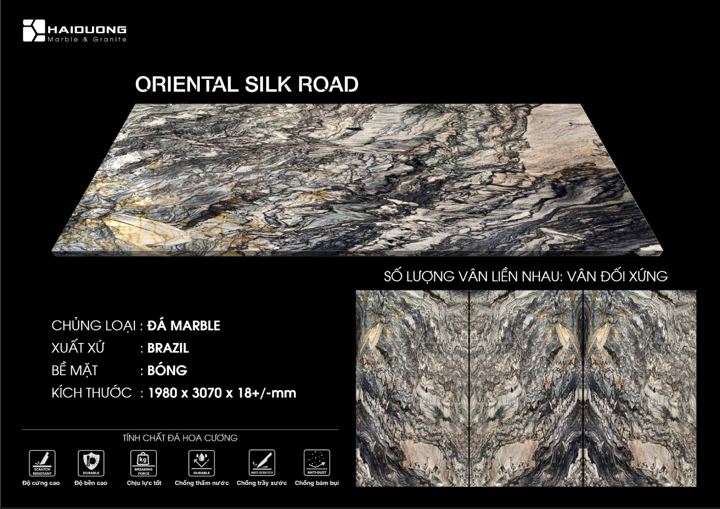 Oriental Silk Road là dòng đá marble tự nhiên cao cấp có xuất xứ từ Brazil, gây ấn tượng mạnh với hệ vân lớn, chuyển động tự do và liên tục như những lớp địa chất cổ xưa. Các đường vân đan xen, cuộn chảy mạnh mẽ, tạo hiệu ứng thị giác sâu và giàu tính nghệ thuật.