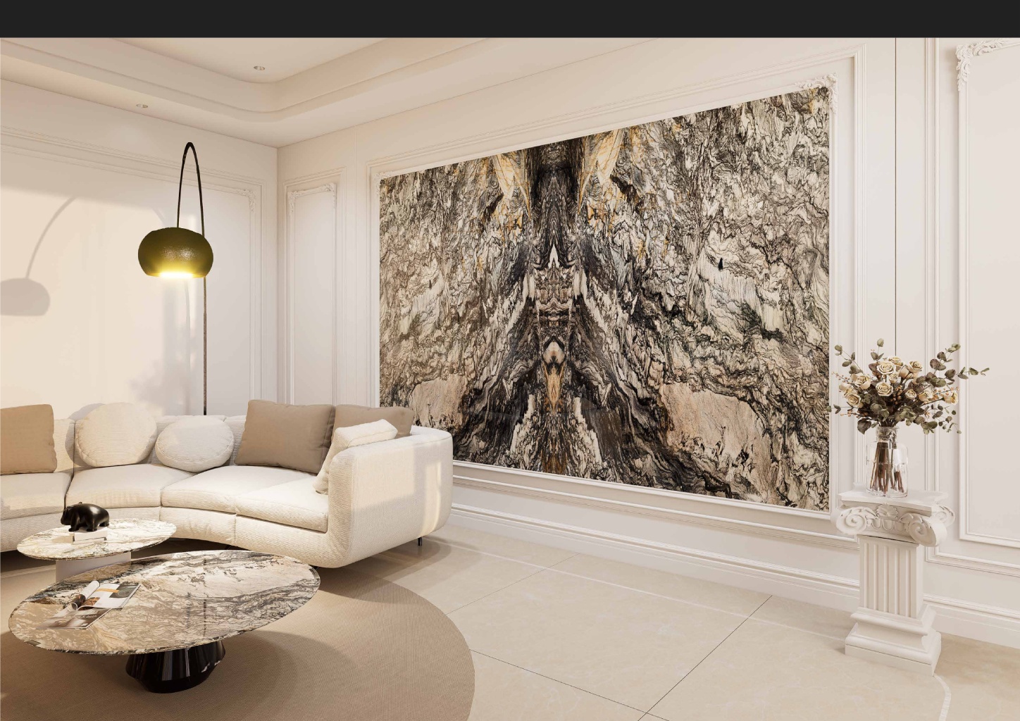 Tông màu chủ đạo là sự hòa quyện giữa xám, đen, kem và ánh vàng nâu tự nhiên, mang đến cảm giác sang trọng, cổ điển nhưng vẫn rất cá tính. Đặc biệt, khả năng ghép vân đối xứng giúp Oriental Silk Road trở thành lựa chọn lý tưởng cho các mảng ốp lớn, tạo điểm nhấn kiến trúc mạnh và đậm chất “statement” cho không gian.
