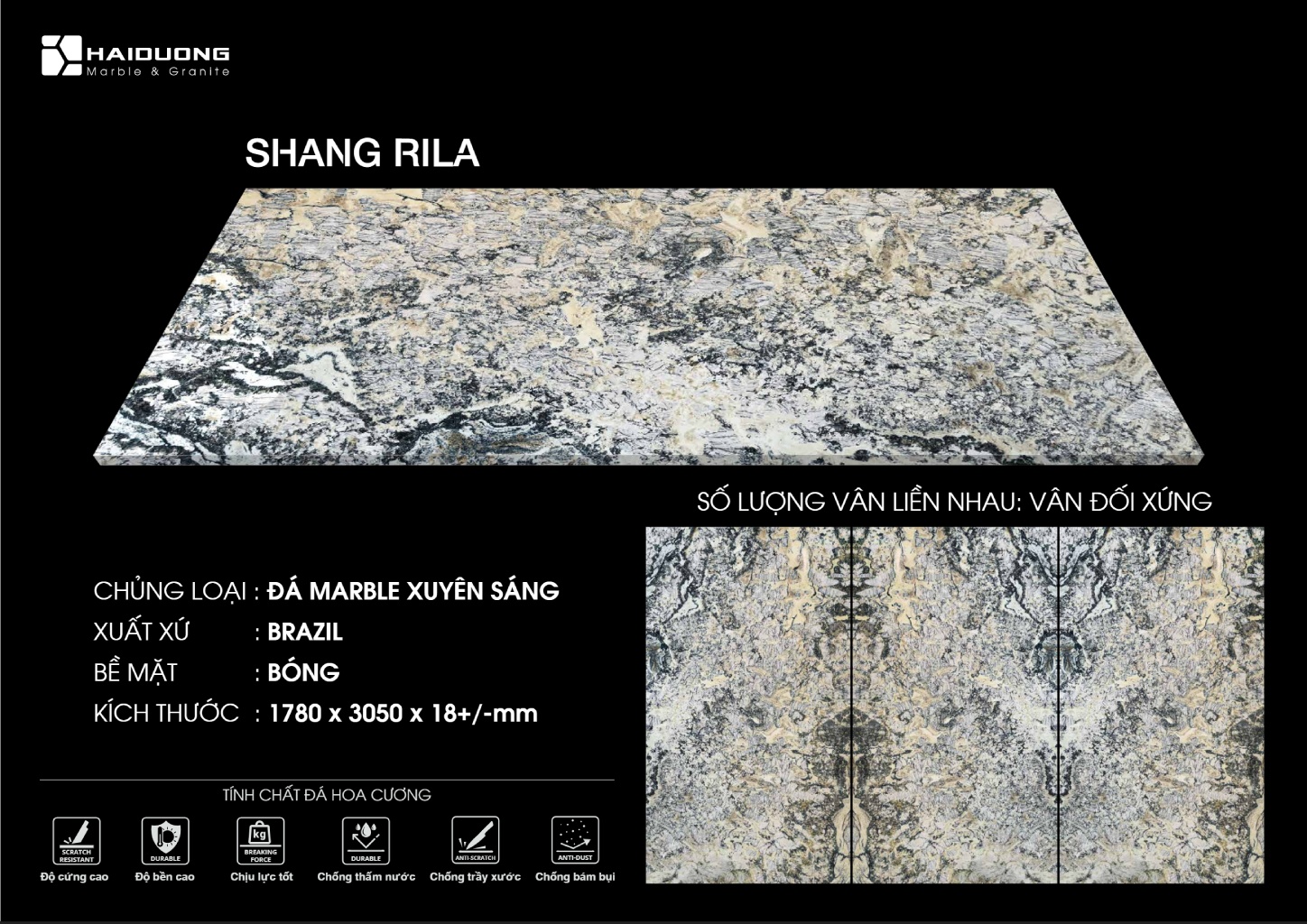 Shang Rila là dòng đá marble xuyên sáng cao cấp sở hữu vẻ đẹp tinh tế và cân bằng, nổi bật với nền màu kem – xám nhạt làm chủ đạo, điểm xuyết các dải vân đen, xám đậm và ánh vàng nhẹ phân bố tự nhiên. Hệ vân mềm mại nhưng rõ nét, tạo cảm giác chiều sâu và sự sang trọng nhẹ nhàng, phù hợp với nhiều phong cách nội thất cao cấp hiện đại.