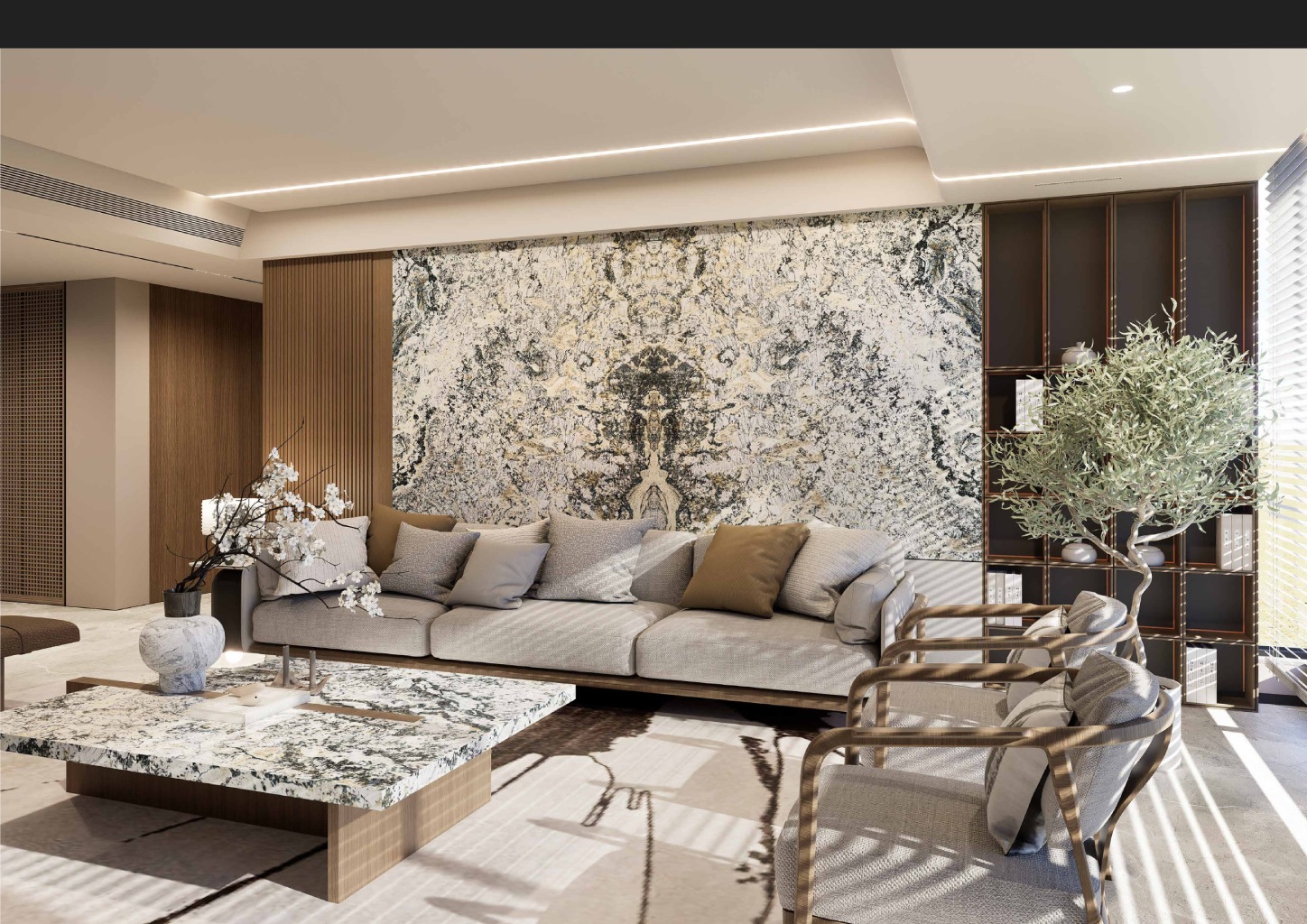 Đá có khả năng ghép vân đối xứng, giúp hình thành các mảng ốp lớn liền mạch, tạo điểm nhấn trang trí rõ ràng cho không gian. Khi kết hợp hệ đèn phía sau, Shang Rila thể hiện hiệu ứng xuyên sáng tự nhiên, làm nổi bật cấu trúc vân đá và lớp khoáng chất bên trong.