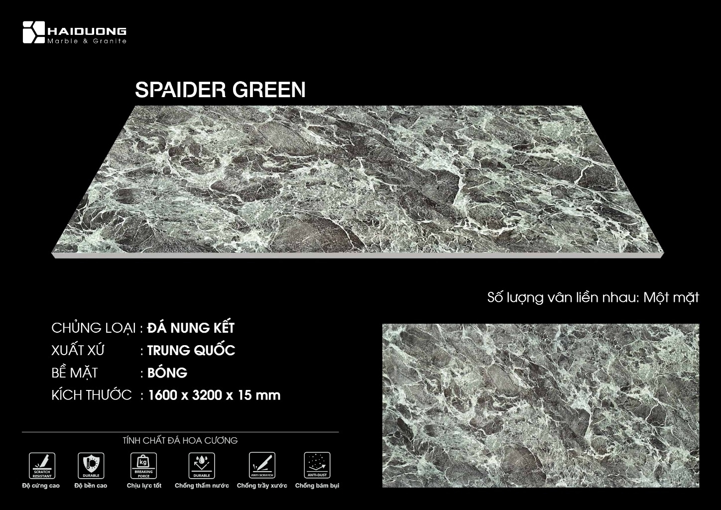 SPAIDER GREEN với màu sắc chủ đạo là màu xanh lá, kèm với đó là những vân trắng xen lẫn với những mảng xanh đậm, tạo nên sự độc đáo và khác biệt. Phù hợp cho nhiều ứng dụng nội thất hiện đại như ốp tường, lát sàn hay mặt bàn. Đá có độ cứng cao, chịu lực tốt, chống thấm nước, trầy xước và bám bẩn hiệu quả, đảm bảo độ bền và tính thẩm mỹ lâu dài.