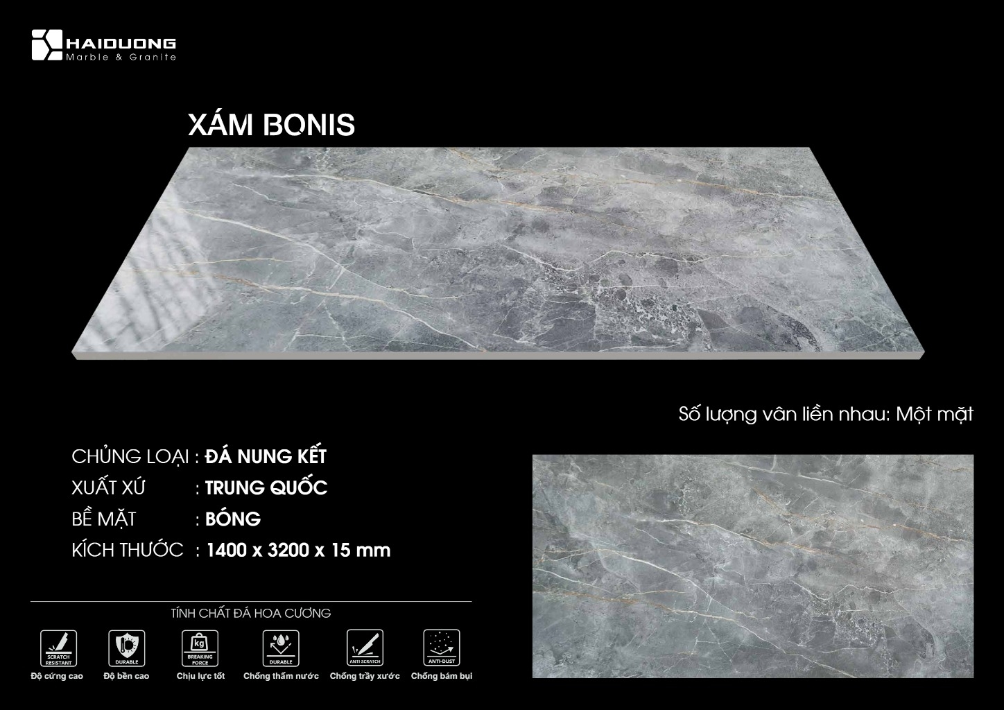 XÁM BONIS được mô tả là “vân đá tự nhiên đơn giản, tinh tế” — không quá rối mắt, mang tới cảm giác nhẹ nhàng. Phù hợp cho nhiều ứng dụng nội thất hiện đại như ốp tường, lát sàn hay mặt bàn. Đá có độ cứng cao, chịu lực tốt, chống thấm nước, trầy xước và bám bẩn hiệu quả, đảm bảo độ bền và tính thẩm mỹ lâu dài.