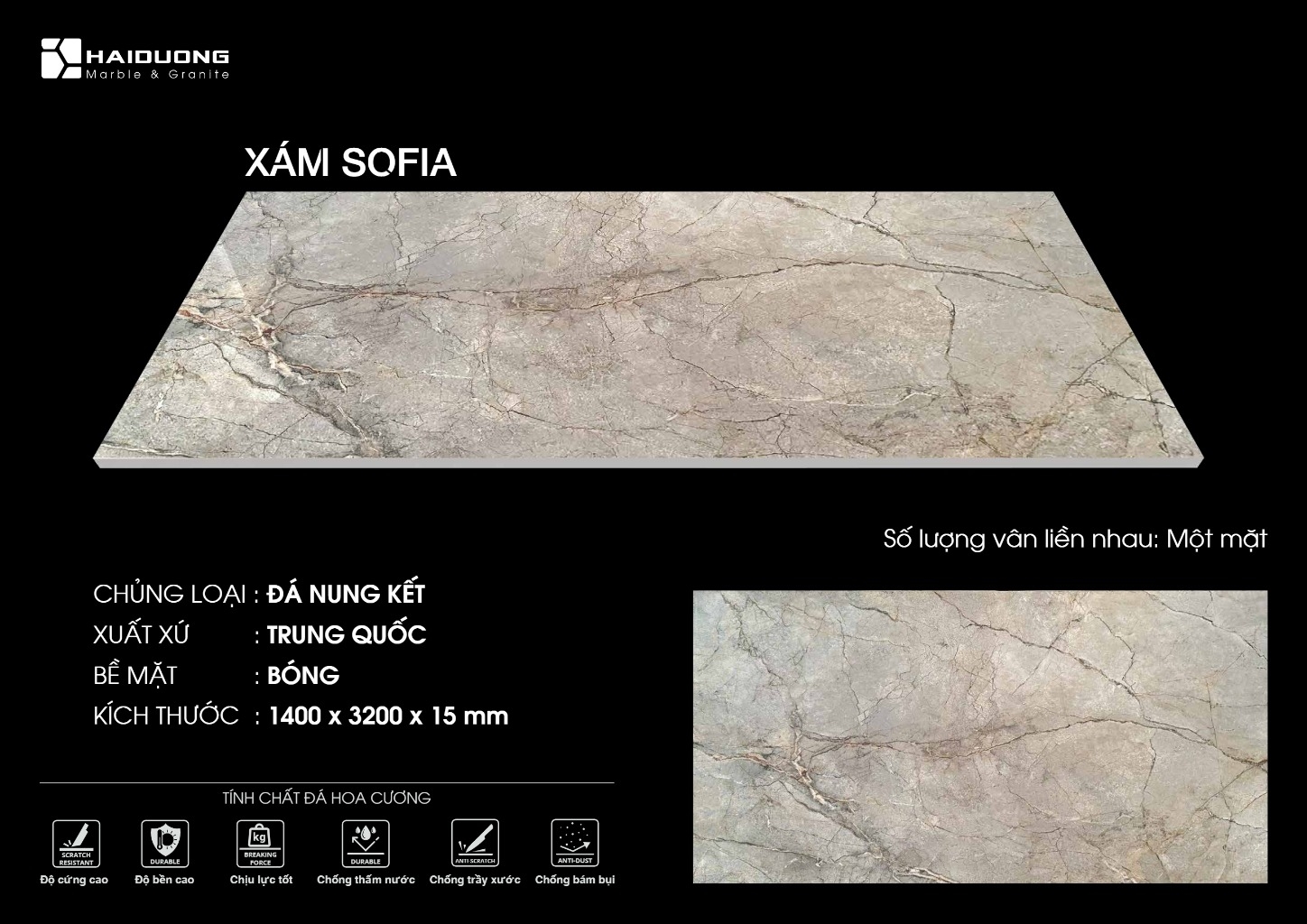 XÁM SOFIA được mô tả là “vân đá tự nhiên đơn giản, tinh tế” — không quá rối mắt, mang tới cảm giác nhẹ nhàng. Phù hợp cho nhiều ứng dụng nội thất hiện đại như ốp tường, lát sàn hay mặt bàn. Đá có độ cứng cao, chịu lực tốt, chống thấm nước, trầy xước và bám bẩn hiệu quả, đảm bảo độ bền và tính thẩm mỹ lâu dài.