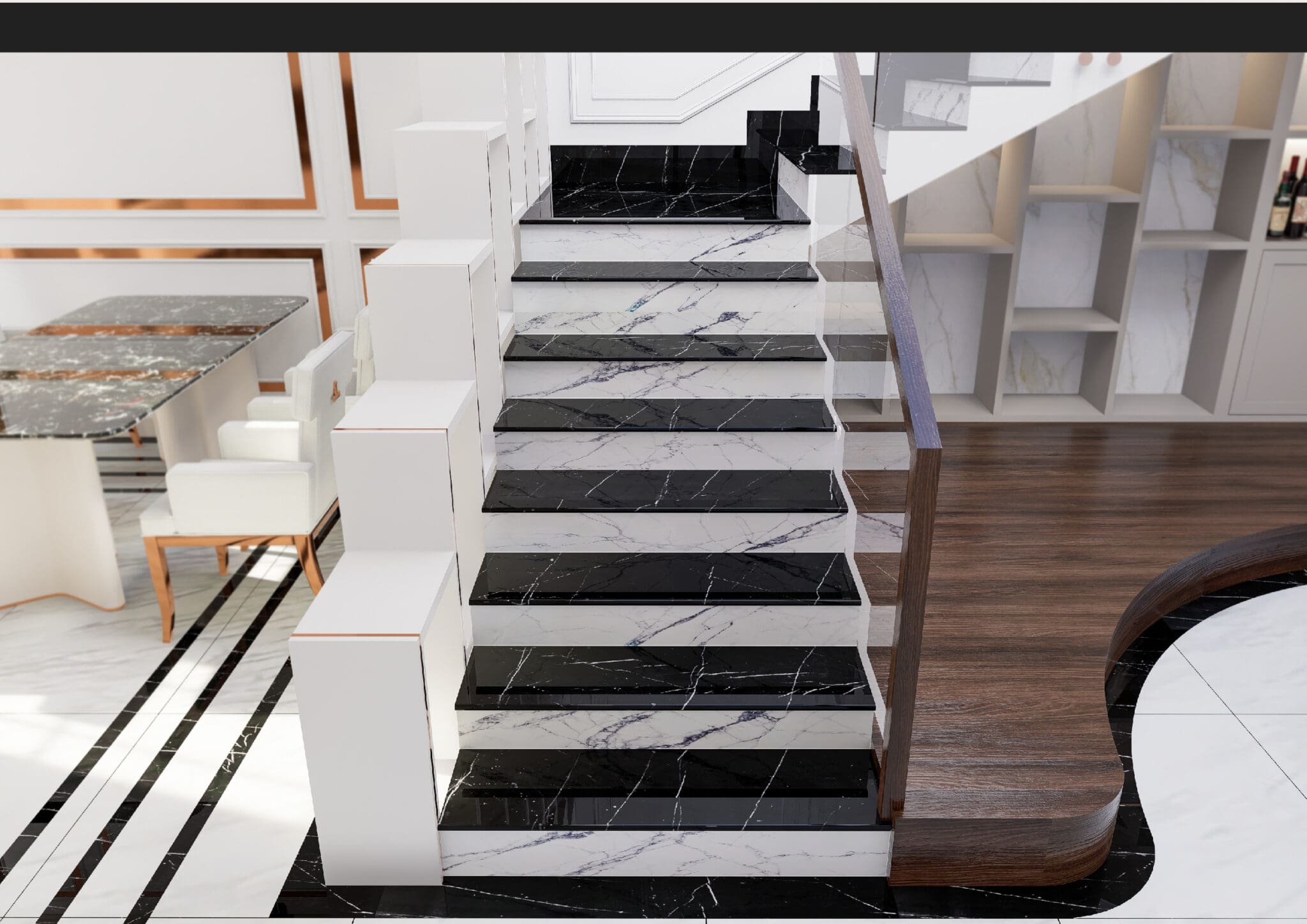 – Cầu thang lớn: Các bạn có thể lựa chọn màu sáng hoặc màu tối đều phù hợp, hoặc có thể xen kẽ giữa màu sáng và màu tối để tạo nên sự nổi bật của những bậc thang.